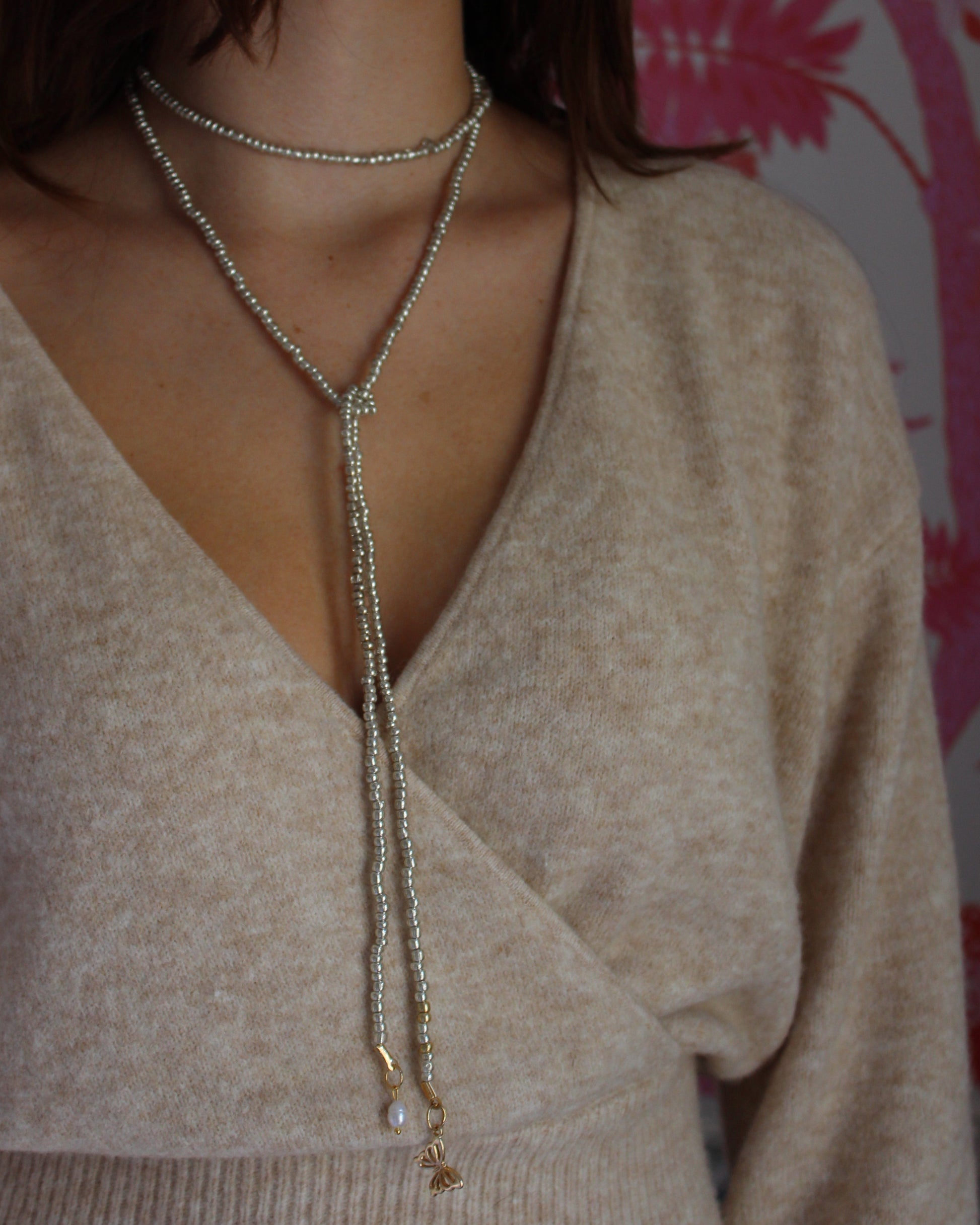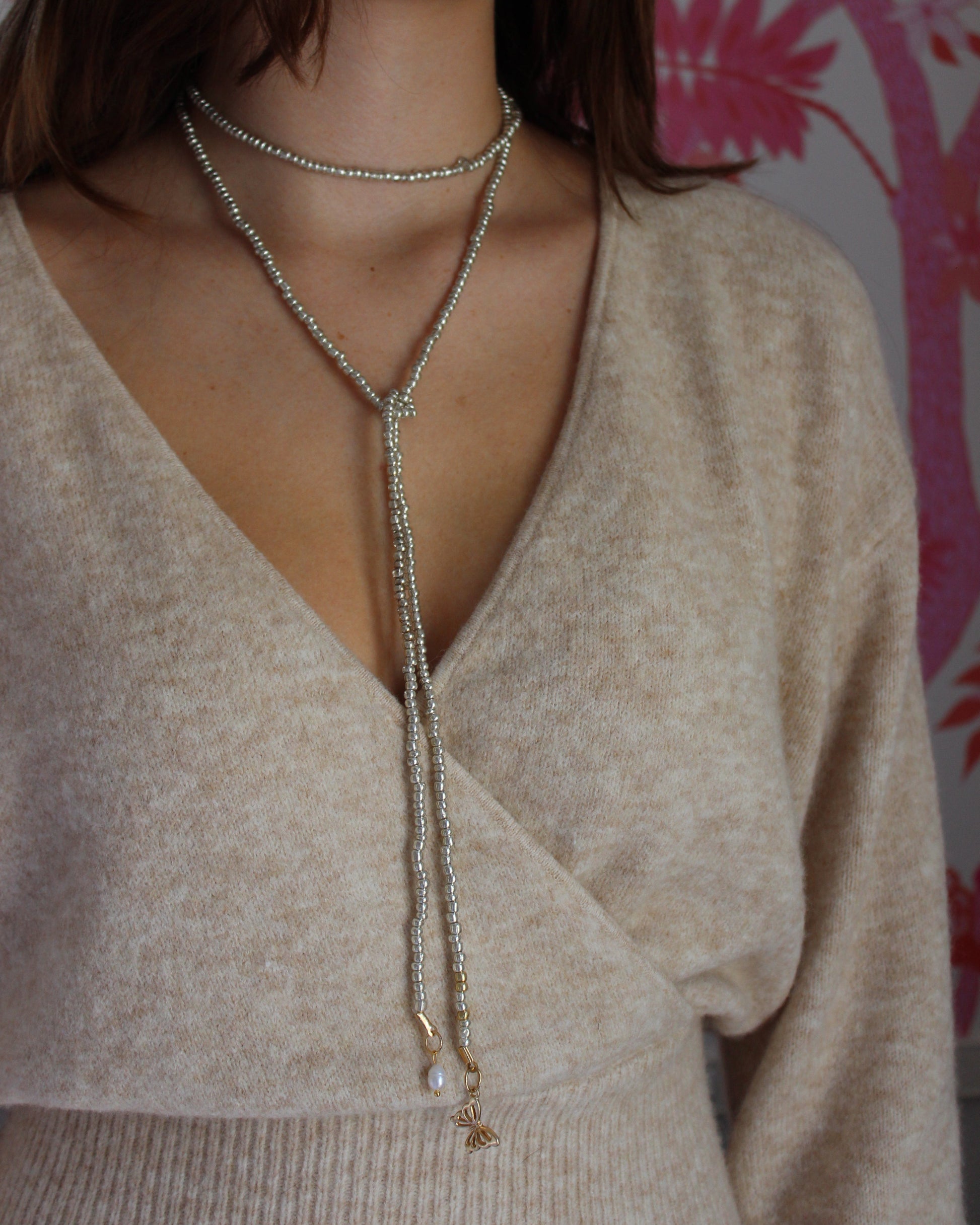 Expertly crafted with precision and elegance, The Abby is a stunning silver seed bead wrap necklace. Its customizable charms at the ends allow for endless possibilities and personalization. Elevate your style with this unique and versatile accessory designed to make a statement.