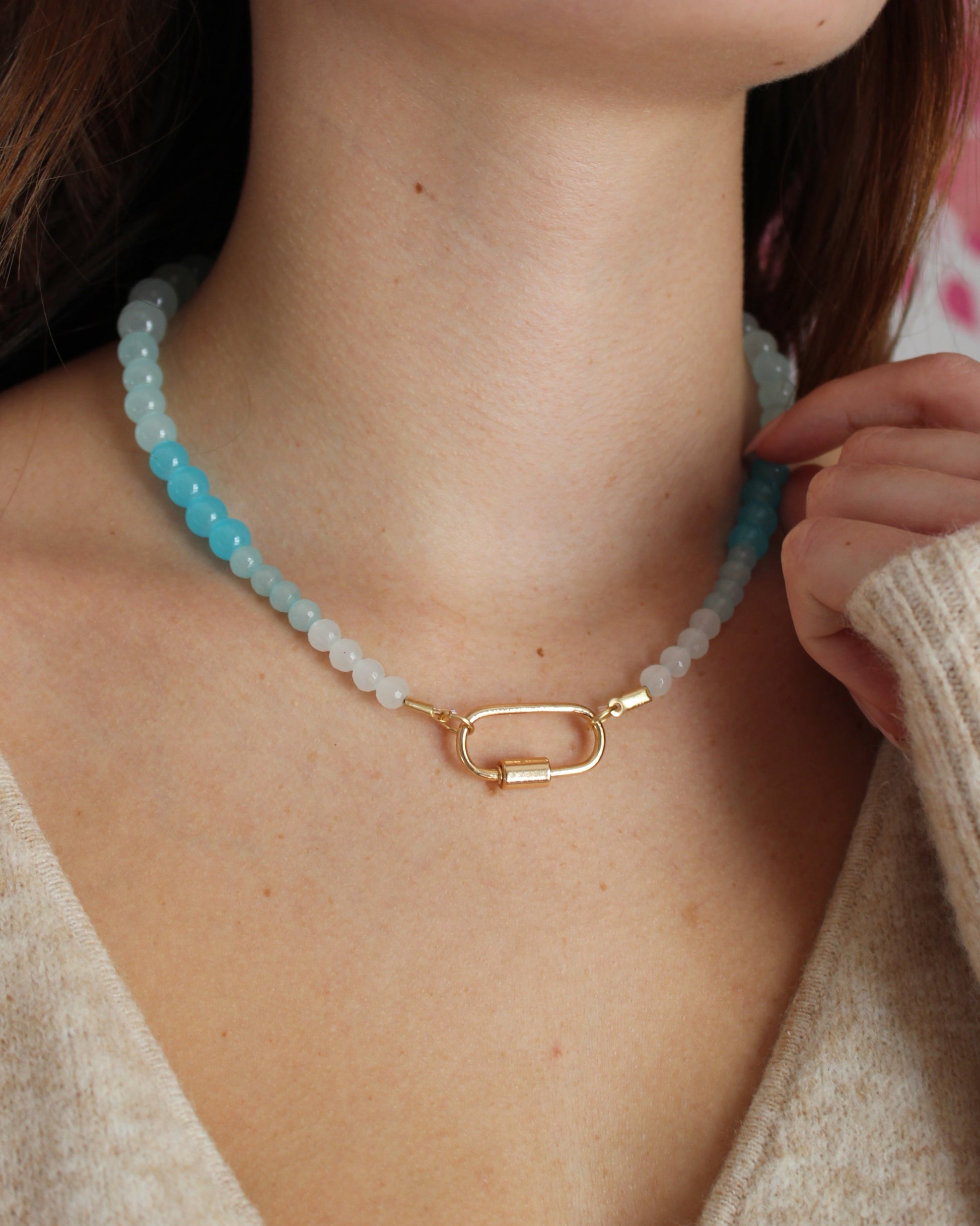Crafted from light blue-colored glass beads, the willow necklace offers customizable charm options with its unique fastener. Elevate your jewelry game with this elegant piece that adds a touch of delicate femininity to any outfit.